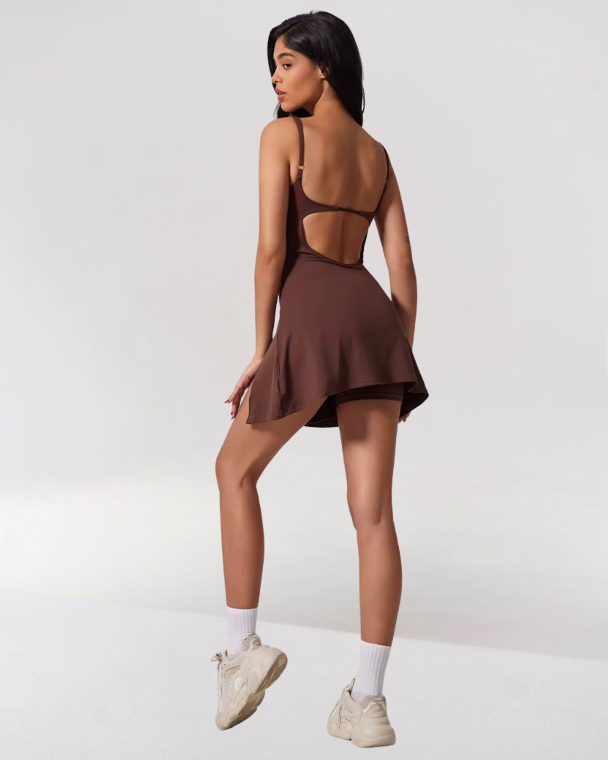 Its beautiful open-back design and seamless silhouette create a flattering, modern profile, while the integrated shorts and removable chest pads ensure you feel secure and confident—every step, stretch, and spin of the way.